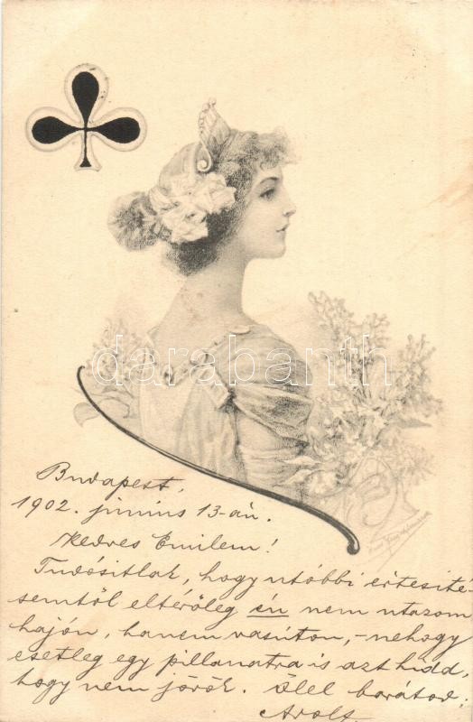 1902 Playing card symbol, lady, artist signed (EK)