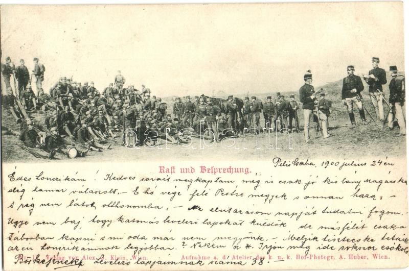 1900 Piliscsaba, Pihenő és megbeszélés a katonai gyakorlaton / Rast und Besprechung / Austro-Hungarian K.u.K. military practice field with resting soldiers and officers. Verlag Alex J. Klein. Hof-Photogr. A. Huber