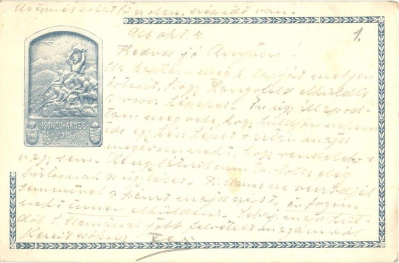 1916 Isonzo-Armee 1915 feliratú ezüst jelvény dombornyomott képe tábori postai levelezőlapon / WWI WWI Austro-Hungarian K.u.K. Emb. silver badge on a military field post (EK)