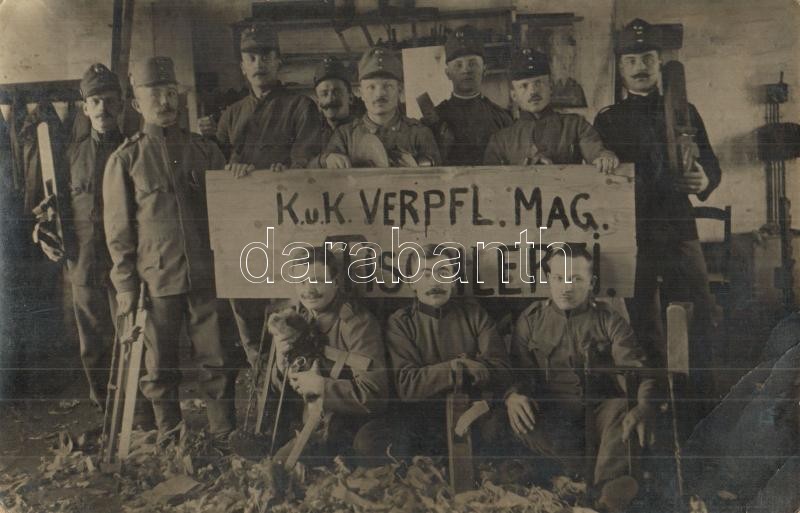 1916 K.u.K. Verpfl. Mag. Tischlerei / Osztrák-magyar katonák asztalos különítménye kutyával és szerszámokkal / WWI Austro-Hungarian military carpenters group photo with dog and tools. photo + K.u.K. Militär-Verpflegs-Magazin in Krakau (EB)