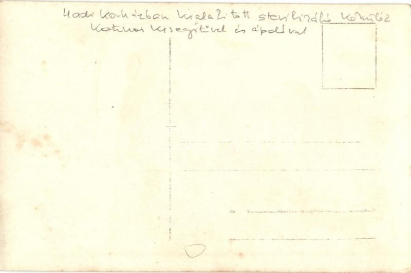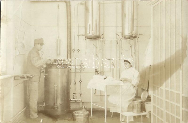 A hadikórházban kialakított sterilizáló készülék katonai kisegítővel és ápolóval / WWI Austro-Hungarian military hospital's sterilizing device with military aide and nurse. photo