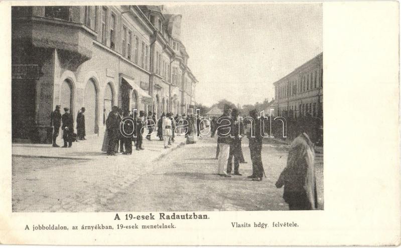 A jobb oldalon, az árnyékban 19-esek menetelnek Radautzban (Radóc). Vlasits hadnagy felvétele. A "Fokos" 19-es frontújság képeiből / WWI Austro-Hungarian military soldiers marching on the right side (in the shade) in Radauti (EK)