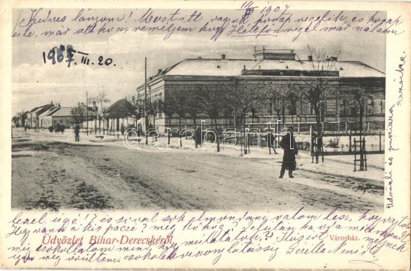 1907 Derecske, Bihar-Derecske; Városháza, utcakép télen (EK) https://www.darabanth.com/hu/329-Gyorsarveres/329.0/Kepeslapok/Magyarorszag~2000005/1907-Derecske-Bihar-Derecske-Varoshaza-utcakep-telen-EK~II1835618