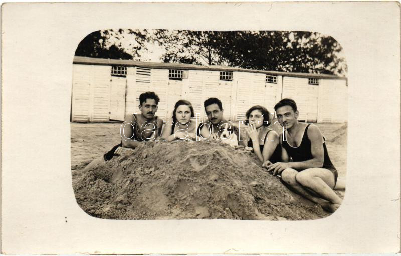 Leírás: 1926 Tatatóváros, Kristály strand, fürdőruhás csoportkép kutyával, homokvárépítés, cigiző lány. photo
