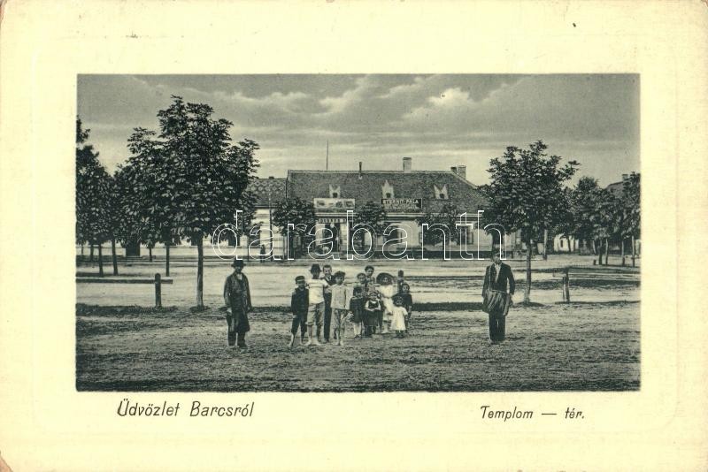 Leírás: Barcs, Templom tér, Eternit Pala, Dorner S. üzlete, gyerekek. W. L. Bp. 5015. Schwarcz Adolf kiadása (EK)