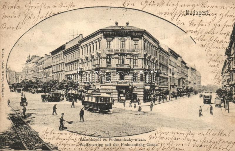 Budapest VI. Váci körút és Podmaniczky utca, villamosok, Teutsch B. József erdélyi borai, Weiss és Társa Betéti Társaság, utcaseprő, csendőr. Divald Károly 246.