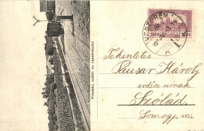 Leírás: Cegléd, Végh Sándor szőlőnagybirtokos szőlő és pincegazdasága, présház a szőlővel és vasúttal, vagon