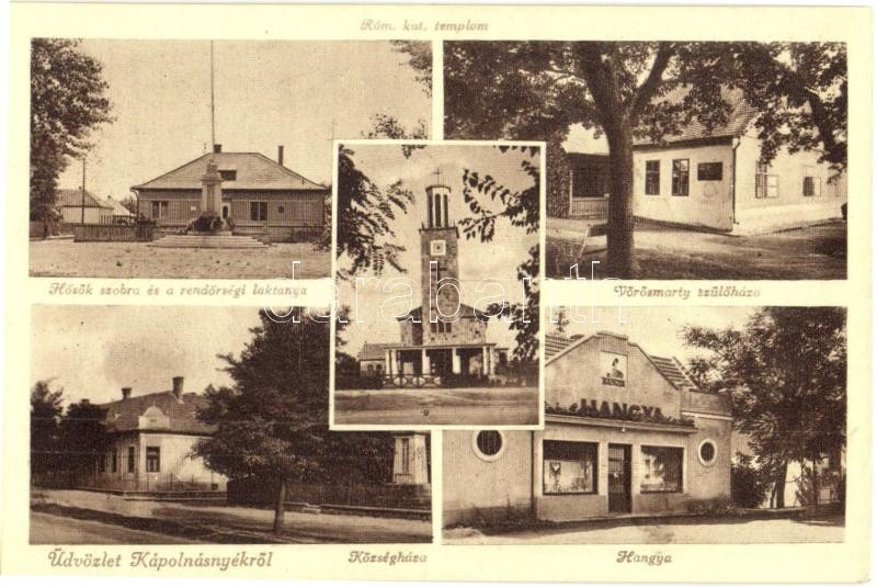 Leírás: Kápolnásnyék, Hősök szobra és rendőrségi laktanya, Községháza, Hangya szövetkezet, Vörösmarty szülőháza