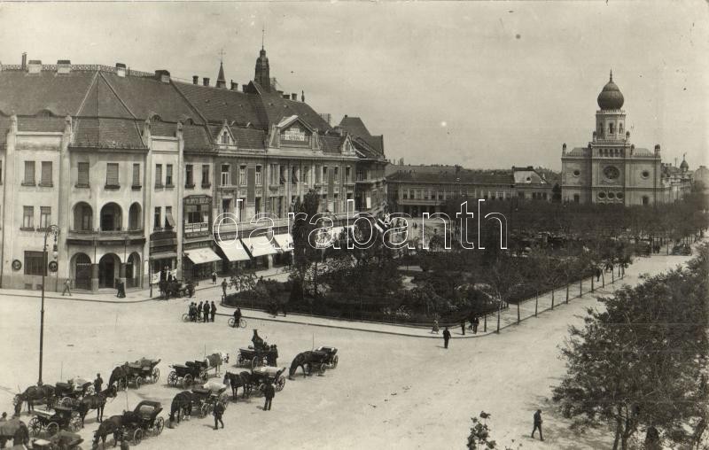 Kecskemét, Szabadság tér, Zsinagóga, Tóth István gyógyszertára, Barta Zsigmond, Szél Nándor, Kellermann Bernát, Réthey Gyula, Goitein Jónás üzlete, Bachler Ilona és Szarvas Babi fényképészeti, háziipari és kézimunka műterme, kerékpár, hintók. G. Fekete Gyula kiadása