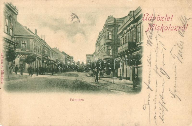 Leírás: Miskolc, Fő utca, Fehér József és Lipót, Adolf üzlete, Grand Hotel Kepes nagy szálloda. Gedeon A. kiadása (EK)