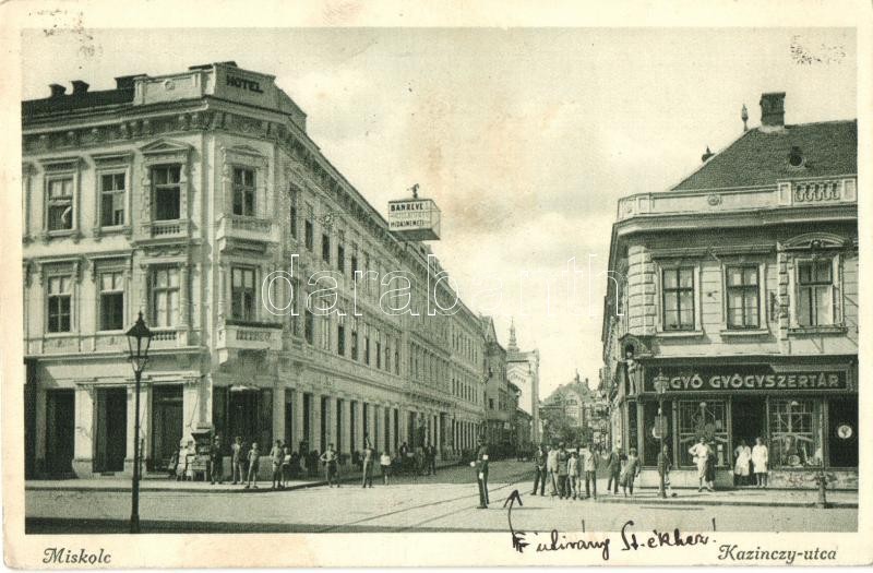 Miskolc, Kazinczy utca, Gyógyszertár, szálloda, hotel (EK) https://www.darabanth.com/hu/329-Gyorsarveres/329.0/Kepeslapok/Magyarorszag~2000005/Miskolc-Kazinczy-utca-Gyogyszertar-szalloda-hotel-EK~II1833808