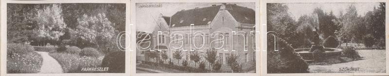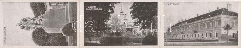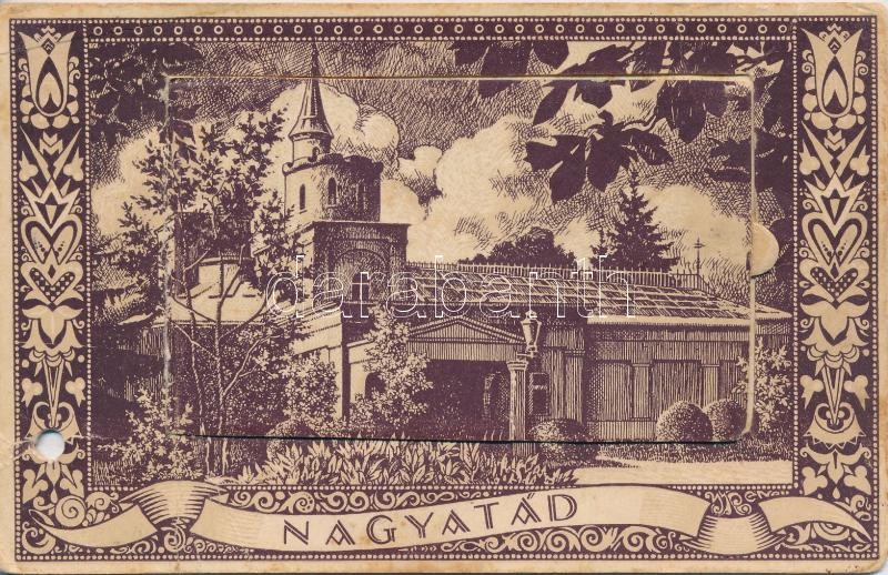 Leírás: Nagyatád, Artézi fürdő. Benyák János és Fiai kiadása, leporellolap, belül: Gyógyszertár, Templom, Széchenyi tér, Hősök szobra, Laktanya, Járásbíróság, stb. (lyuk / hole)