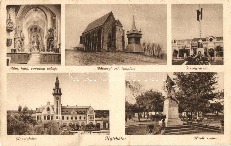Leírás: Nyírbátor, Községháza, Országzászló, Hősök szobra, Báthory református templom, Római katolikus templom belső (EB)