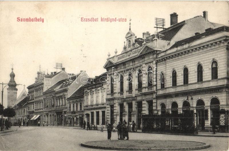 Szombathely, Erzsébet királyné utca, Babics Gyógyszertár, Balassa Mihály Café Elite kávéháza, Heigl István kávéháza, Takarékpénztár, Hoffmann Samu és fia üzlete. Granitz Vilmos kiadása (EK)