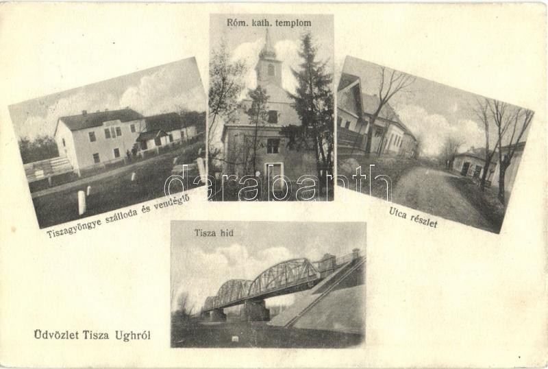 Leírás: Tiszaug, Tiszagyöngye szálloda és vendéglő, étterem, Római katolikus templom, utcakép, üzlet, Tisza híd. Készítette Szabó Ferenc fényképész (EK)