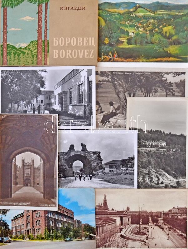 Kb. 300 db régi és modern képeslap, sok magyar és külföldi város, motívumok, kis alakú lapok dobozban / Cca. 300 pre-1945 and modern postcards, many Hungarian and European towns and motives, some small sized cards in a box