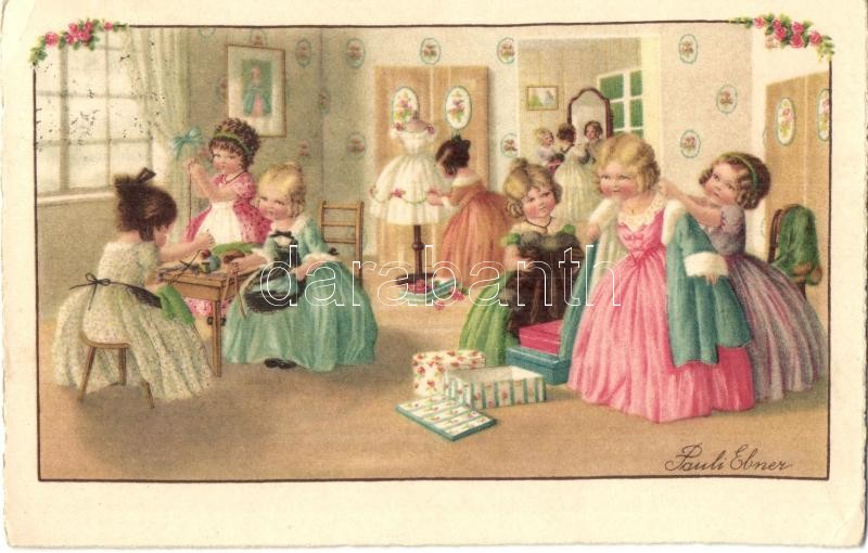 Girls in the sewing workshop. litho s: Pauli Ebner (EK) https://www.darabanth.com/hu/329-Gyorsarveres/329.0/Kepeslapok/Muveszlapok~2000035/Girls-in-the-sewing-workshop-litho-s-Pauli-Ebner-EK~II1791015