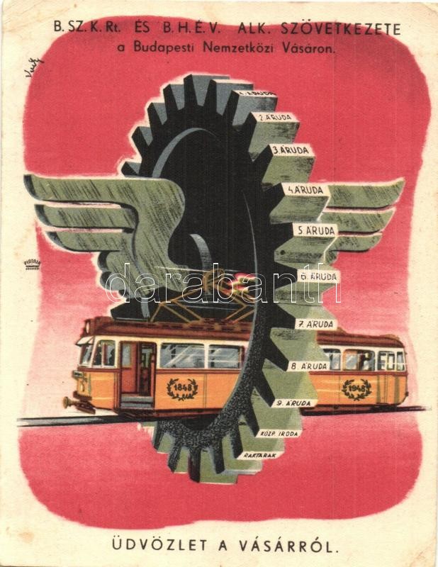 1948 Budapesti Nemzetközi Vásár, B.Sz.K.Rt. és B.H.É.V. Alk. szövetkezete reklámlap, villamos / Hungarian international fair's advertisement, tram, artist signed (EK)