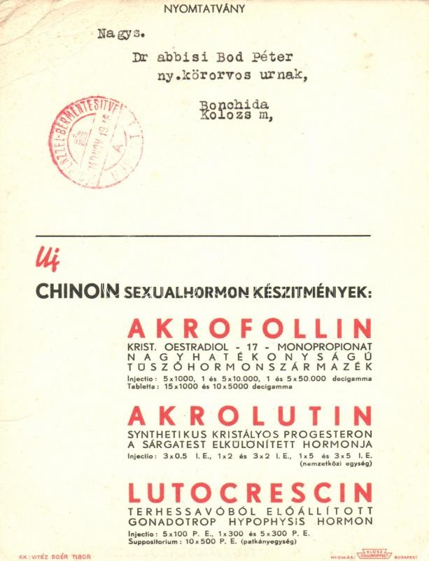 Leírás: Chinoin sexualhormon készítmények, reklám / medicine advertisement (12.8 x 17 cm) (EB)