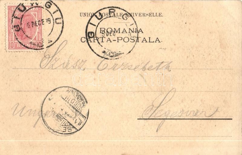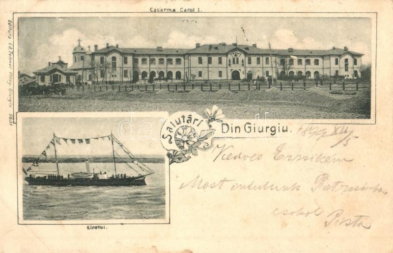 1899 Giurgiu, Gyurgyevó; Casarma Carol I, Siretul. Editura Fellmer Fotog. 560. / military barracks, Siret river with Romanian ship. Art Nouveau, floral (fl)