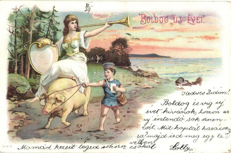 1902 Boldog új évet / New Year greeting postcard, pig, litho https://www.darabanth.com/hu/329-Gyorsarveres/329.0/Kepeslapok/Udvozlolapok-Unnepek~2000044/1902-Boldog-uj-evet-New-Year-greeting-postcard-pig-litho~II1836609