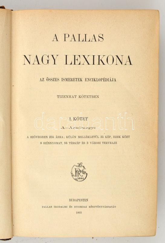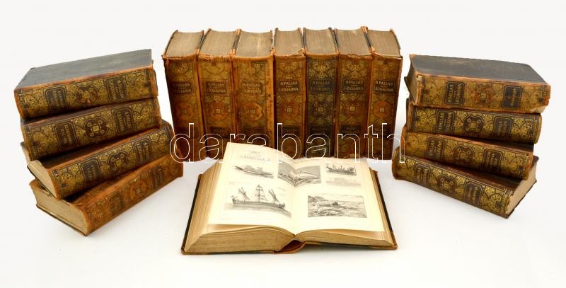 A Pallas Nagy Lexikona. Az összes ismeretek enciklopédiája. 1-16. kötetek. Budapest, 1893-1897, Pallas Irodalmi és Nyomdai Rt. Szövegközti képekkel, térképekkel, chromolitográfiákkal gazdagon illusztrálva. Kiadói egységes, aranyozott gerincű félbőr kötésben, kopottas borítóval, kopottas, néhol sérült gerincekkel, de belül alapvetően jó állapotban.