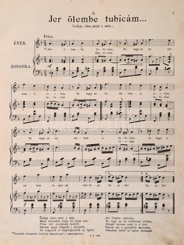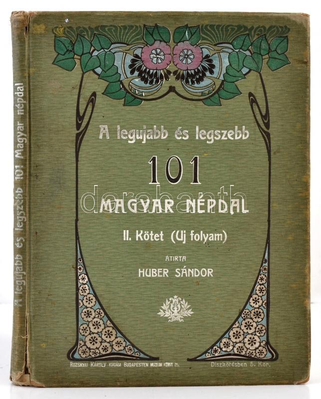 A legujabb és legszebb 101 magyar népdal II. kötet. (Uj folyam.) Átírta Huber Sándor. Bp.,é.n., Rozsnyai Károly. Kiadói illusztrált, festett egészvászon-kötés, kopott, foltos borítóval, sérült gerinccel, laza fűzéssel, kijáró lapokkal.