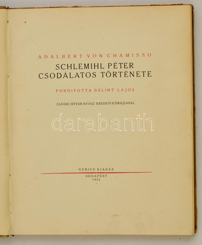 Adalbert von Chamisso: Schlemihl Péter csodálatos története. Fordította Bálint Lajos. Zádor István nyolc eredeti kőnyomatával. A kötésterv Végh Gusztáv munkája. Bp.,1921, Genius, 123 p. 8 t.