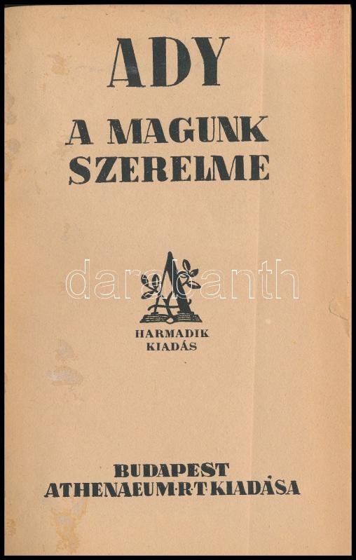 Ady Endre: A magunk szerelme. Sajtó alá rendezte: Dr. Földessy Gyula. Bp.,[1924], Athenaeum. Harmadik kiadás. Kiadói aranyozott egészvászon-kötés, kissé kopott borítóval, jó állapotban.