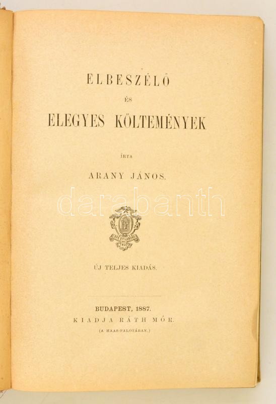 Toldi szerelme. (Ötödik kiadás.)+Toldi. Toldi estéje. Buda halála. Murány ostroma. (Ötödik kiadás.)+Arany János elbeszélő és elegyes költemények. (Új teljes kiadás.) Bp.,1882-1887, Ráth Mór. Kiadói dúsan aranyozott egészvászon-kötés, aranyozott lapélekkel, kissé kopott borító sarkokkal, két kötet gerince kissé sérült,