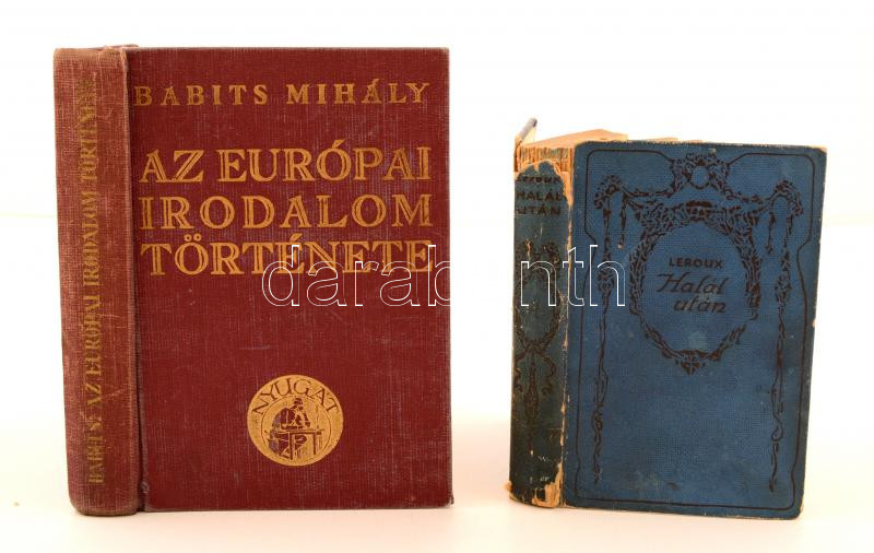 Babits Mihály: Az európai irodalom története. Bp., é. n., Nyugat. Kopott vászonkötésben, egyébként jó állapotban.; Leroux, Gaston: Halál után. Bp., 1920, Athenaeum. Sérült gerincű vászonkötésben.