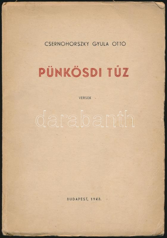 Leírás: Csernohorszky Gyula Ottó: Pünkösdi tűz. Versek. Bp.,1943, Hunnia-nyomda Kft., 1 t.+64 p. Kiadói papírkötés.
