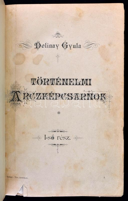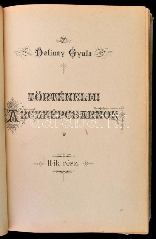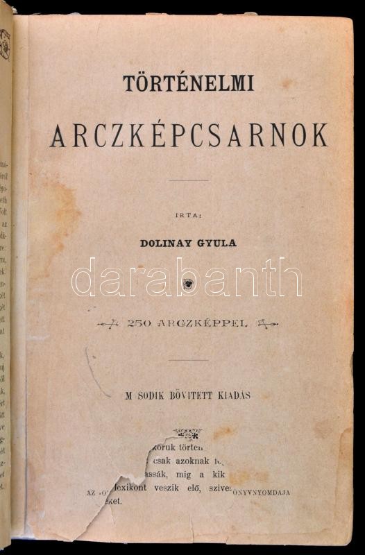 Dolinay Gyula: Történelmi arcképcsarnok. [Bp.,1893, Országgyülési Értesítő Kő- és Könyvnyomdája], VIII+960 p. Második,bővített kiadás. Számos szövegközti és egészoldalas illusztrációval. Félvászon-kötésben, javított gerinccel, a javításkor az 1/2 oldal hibásan, a címlap elé lett bekötve, kopott borítóval, a címlap és a két lap sérült, hiányos (3/4., 9-10.)