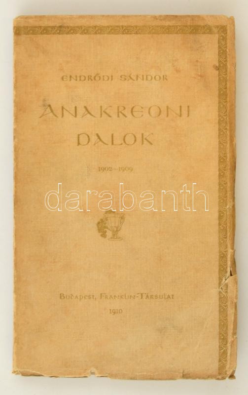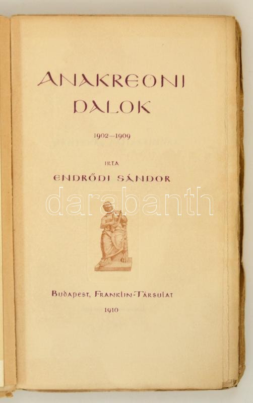 Leírás: Endrődi Sándor: Anakreoni dalok 1902-1909. Bp., 1910, Franklin. Részben felvágatlan példány. Kissé kopott papírkötésben, egyébként jó állapotban.