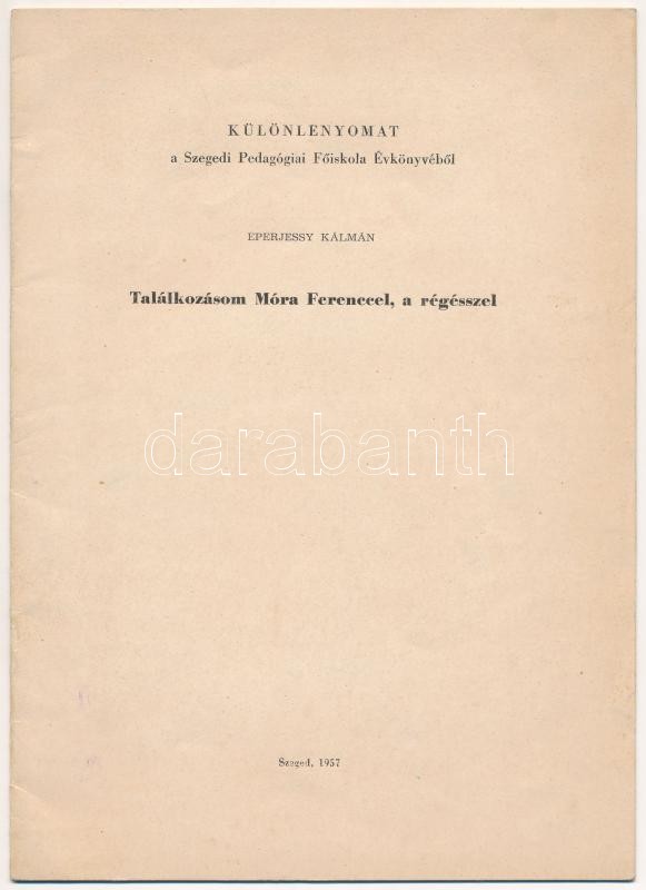 Eperjessy Kálmán: Találkozásom Móra Ferenccel, a régésszel. Különlenyomat a Szegedi Pedagógiai Főiskola Évkönyvéből. Szeged, 1957, 27-40 p. Papírkötésben.