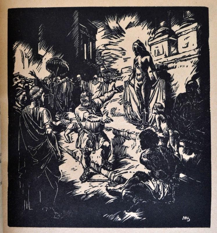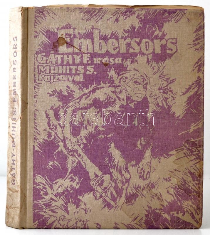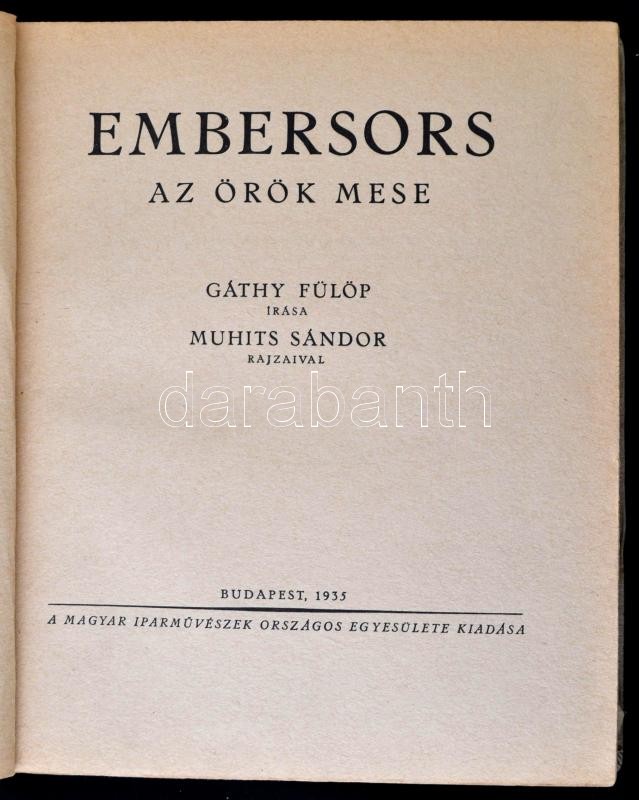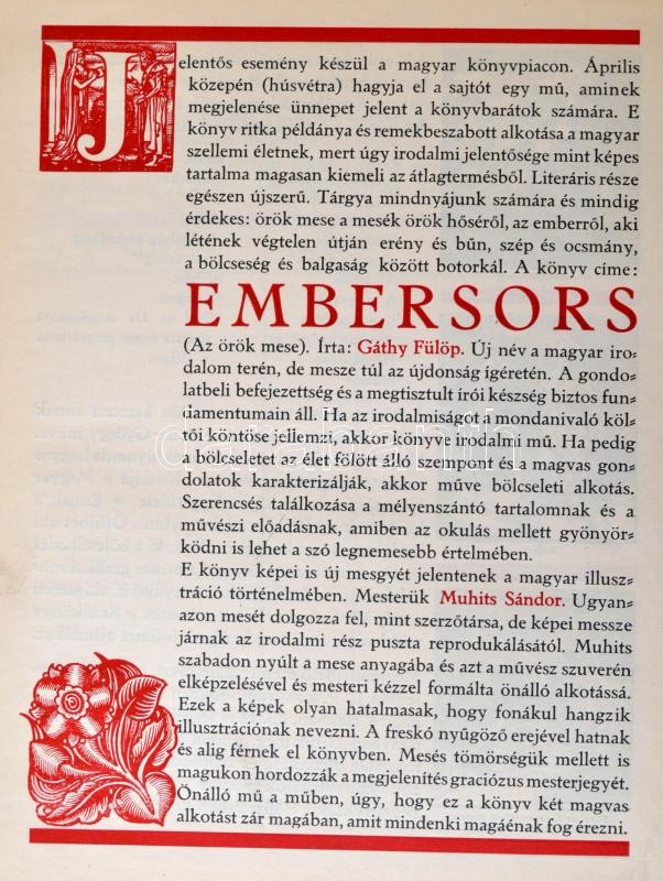 Gáthy Fülöp: Embersors. Az örök mese. Muhits Sándor rajzaival. Bp., 1935. Magyar Iparművészek Országos Egyesülete,(Kir. M. Egyetemi Nyomda-ny.),126+1+6 p. Lapszámozáson belül 20 egészoldalas fametszettel. A fametszést Kaza György végezte. Japánfűzésű lapokkal. Megrendelőlappal. Kiadói egészvászon-kötés, foltos, kopott borítóval, 74-81. oldalak között három szakadt lappal. Megjelent 1000 példányban. A szerző és az illusztrátor által aláírt tiszteletpéldány.