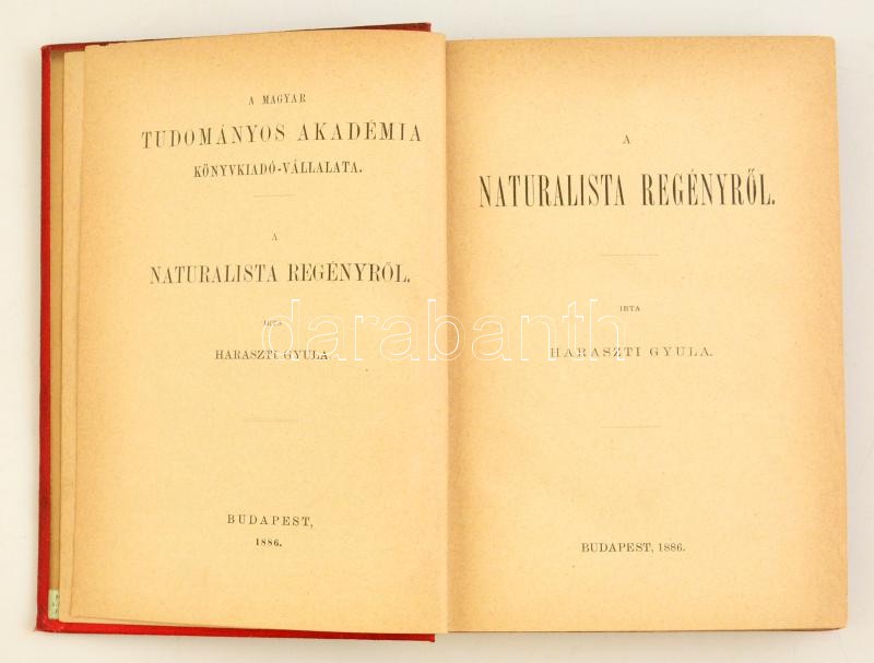 Haraszti Gyula: A naturalista regényről. Bp.,1886, MTA. Kiadói egészvá... https://www.darabanth.com/hu/329-Gyorsarveres/329.0/Konyvek/Konyvek-Egyeb-ritkasagok~1000018/Haraszti-Gyula-A-naturalista-regenyrol-Bp-1886-MTA-Kiadoi-egeszvaszon-kotes-kisse-kopo~II1818922