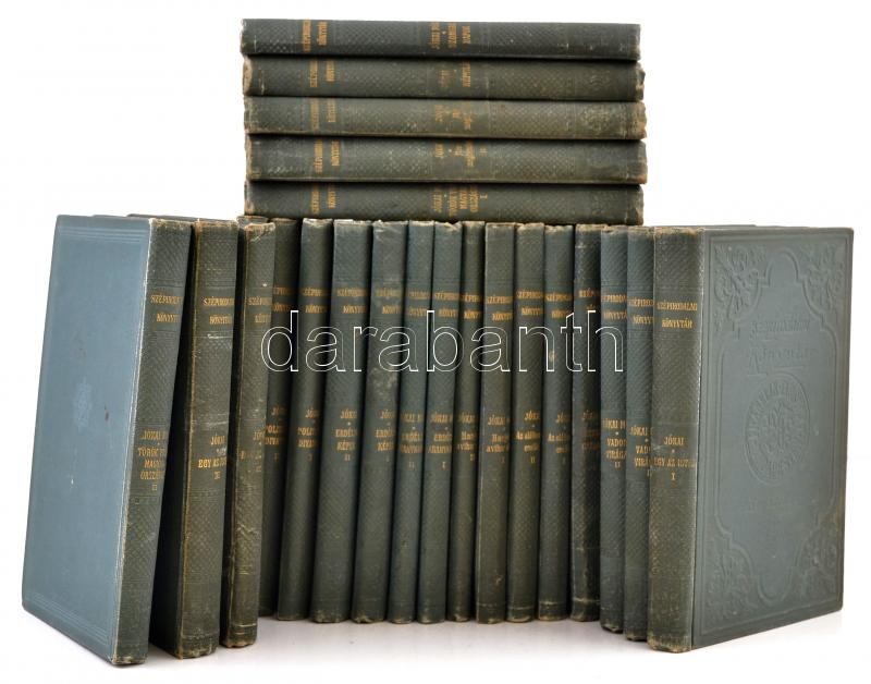 Jókai Mór munkái, Szépirodalmi könyvtár sorozat 24 kötete: Szomorú napok, Népvilág, Mire megvénülünk I-II. kötet., Török világ Magyarország I-II.kötet,Vadon virágai I-II. kötet, Erdély aranykora I-II, Erdélyi képek I-II. kötet, Politikai divatok I-III. kötet, Egy az Isten I-III. kötet, Hangok a vihar után I-II. kötet, Az elátkozott család I-II. kötet, Szegény gazdagok I-II. kötet. Bp., 1901-1905, Franklin-Társulat. Kiadói aranyozott gerincű, dombornyomásos zöld egészvászon-kötés, változó állapotban, többnyire kissé kopottas borítóval, és gerinccel.