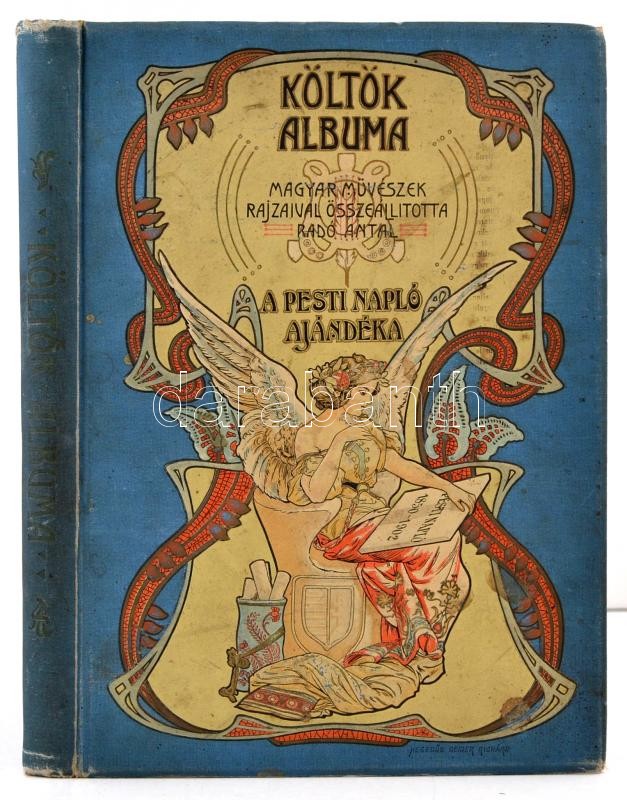 Költők albuma. Jelenkori magyar költők verseiből. Szerk.: Radó Antal. Harminczöt magyar festőművész képeivel. A Pesti Napló karácsonyi ajándéka előfizetőinek. Budapest, é.n., Lampel Róbert (Wodianer F. és Fiai)., 284 p. Negyedik, módosított és bővített kiadás. Kiadói aranyozott, dombornyomott, festett kiadói egészvászon kötésben, festett lapélekkel, Hátsó borító erősen foltos.
