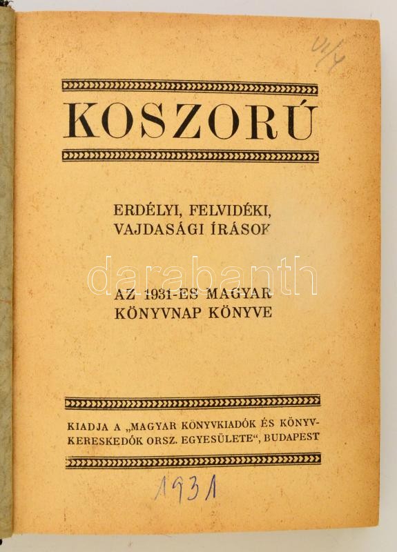 Leírás: Koszorú. Erdélyi, felvidéki, vajdasági írások. Az 1931-es magyar könyvnap könyve. Bp., 1931, "Magyar Könyvkiadók és Könyvkereskedők Orsz. Egyesülete. Átkötött félvászon-kötés, kopott borítóval, kissé sérült gerinccel.