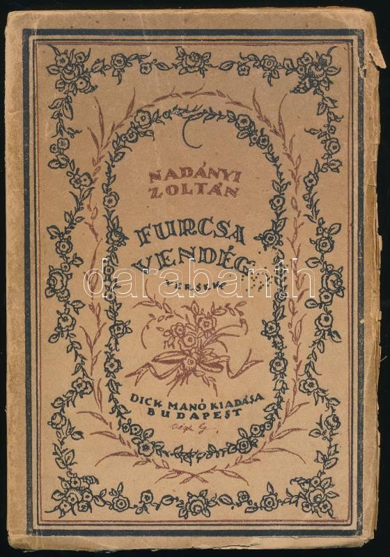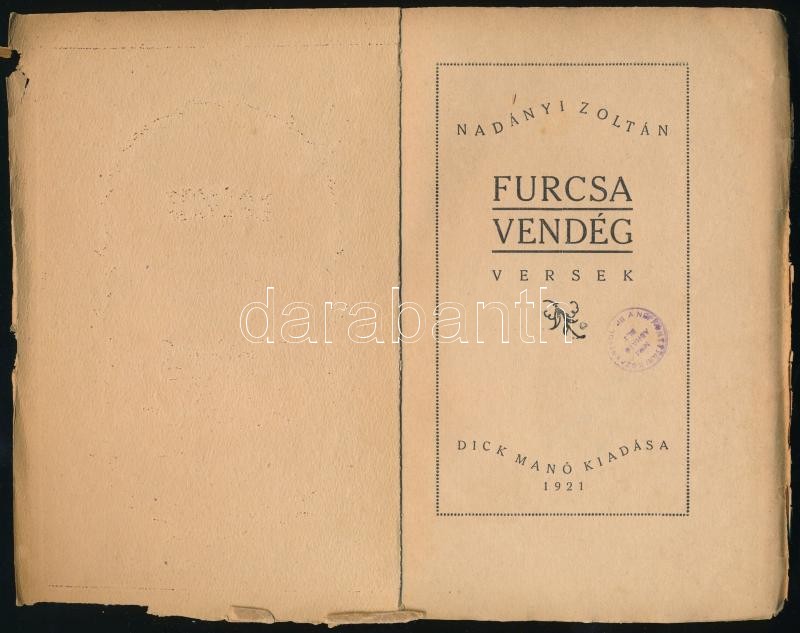 Leírás: Nadányi Zoltán: Furcsa vendég. Versek. Bp.,1921, Dick Manó, (Jókai Nyomda Rt.-ny.) Kiadói illusztrált papírkötés, megviselt állapotban, szakadt, foltos borítóval, intézményi bélyegzővel. A borító Végh Gusztáv munkája.
