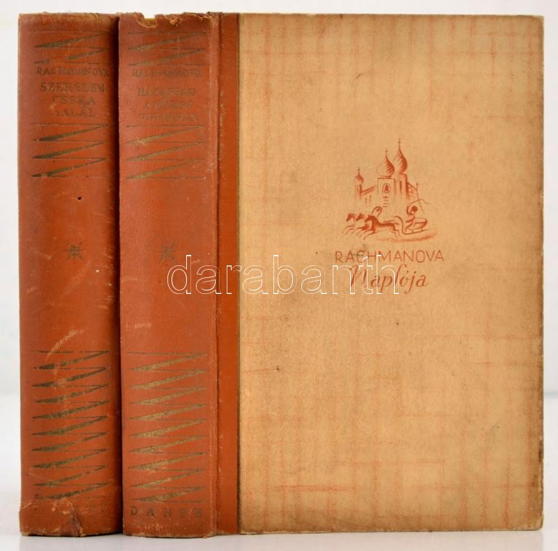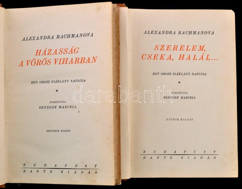 Rachmanova, Alexandra: Rachmanova naplója I.-II. kötet. I. kötet: Szerelem, Cseka, halál, ... Egy orosz diáklány naplója. (Ötödik kiadás.) II. kötet: Házasság a vörös viharban. Egy orosz diáklány naplója. (Negyedik kiadás.) Fordította: Benedek Marcell. Halhatatlan könyvek. Bp.,é.n.,Dante. Kiadói félbőr-kötés, kopott borítóval.