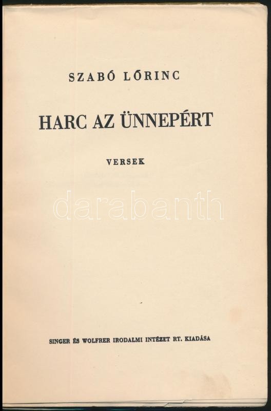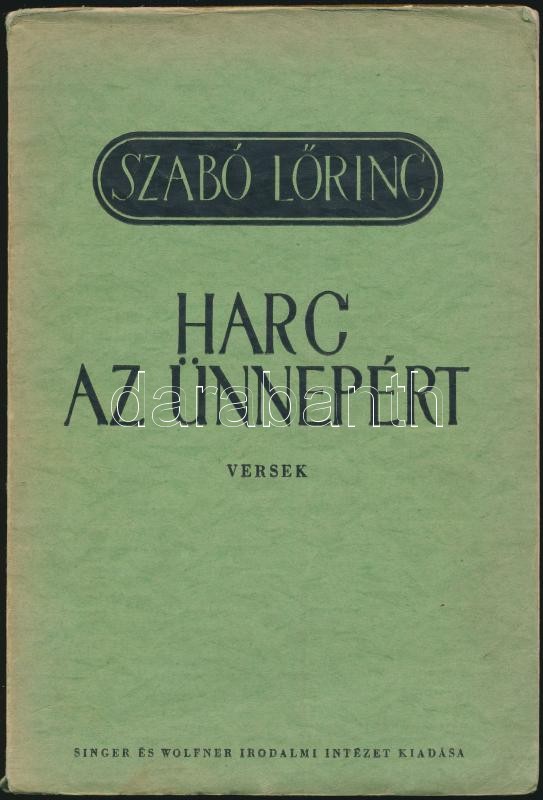 Szabó Lőrinc: Harc az ünnepért. Versek. Bp.,(1938), Singer és Wolfner Irodalmi Intézet Rt.,(Kecskemét, Első Kecskeméti Hírlapkiadó- és Nyomda-Rt.), 170 p. Kiadói papírkötésben, jó állapotban. Első kiadás.