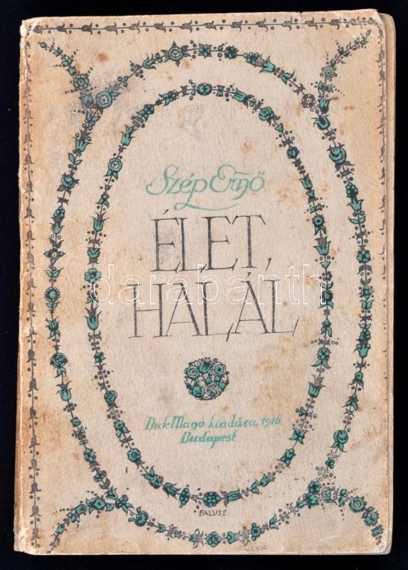 Szép Ernő: Élet, halál. Bp., 1916, Dick Manó. Első kiadás. Kiadói illusztrált papírkötés, kissé sérült, kissé hiányos gerinccel, kissé szakadt papírborítóval, a kötése sérült, és hibás, az első 32 oldal meglazult, részben kijár, 33-80. oldalak a 130-131. oldalak között találhatók a könyvben, 33-80. oldalak kijárnak. A borító illusztrációja Falus Elek (1884-1950) munkája.