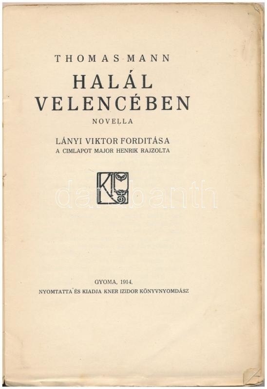 Thomas Mann: Halál Velencében. Novella. Lányi Viktor fordítása. A borítót Major Henrik rajzolta. Gyoma, 1914, Kner Izidor, 109+3 p. Kiadói papírkötés, szakadt, sérült gerinccel. Első kiadás.