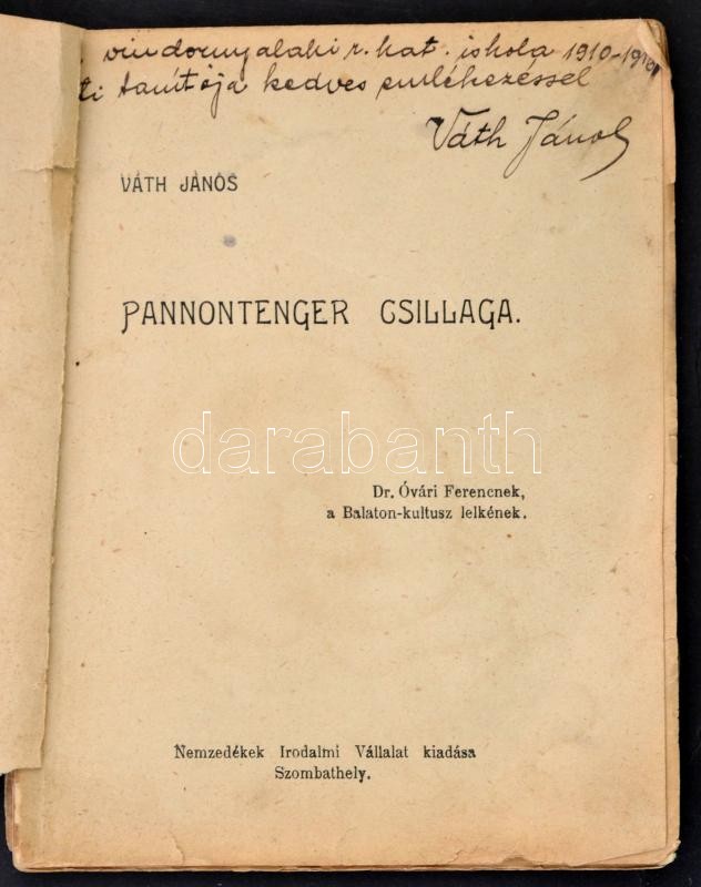 Váth János: Pannontenger csillaga. Szombathely, [1917], Nemzedékek Iro... https://www.darabanth.com/hu/329-Gyorsarveres/329.0/Konyvek/Konyvek-Egyeb-ritkasagok~1000018/Vath-Janos-Pannontenger-csillaga-Szombathely-1917-Nemzedekek-Irodalmi-Vallalat-A-szerzo-~II1803195