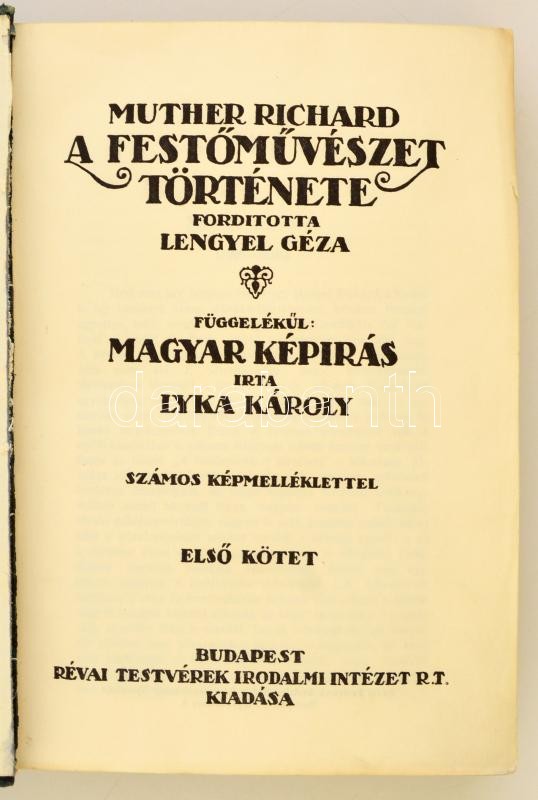 Muther Richard: A festőművészet története. Fordította Lengyel Géza. Függelék: Lyka Károly: Magyar képírás. Budapest, é.n., Révai Testvérek. Kiadói aranyozott gerincű félbőr kötésben, jó állapotban