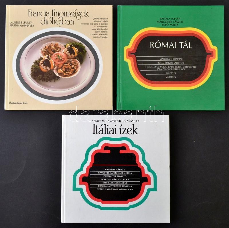3 db könyv - Simeoni Szekeres Magda: Itáliai ízek; Bajtala-Marczinek-Pető: Római tál; Leuilly-Márton: Francia finomságok dióhéjban. Kiadói kartonált kötés, jó állapotban.
