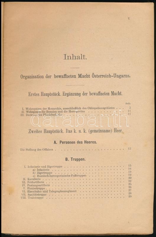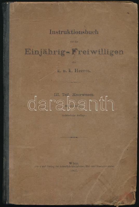 Instruktionsbuch für die Einjährig-Freiwilligen des k.u.k. Heeres. III. theil. Heerwesen. Wien, 1907, K.u.K. Hof- und Staatsdruckerei, XI+116 p. Német nyelven. Kiadói félvászon-kötésben, kissé sérült gerinccel, kissé kopott borÃtóval, foltos, ceruzás aláhúzásokkal, a két melléklet hiányzik.