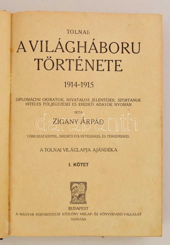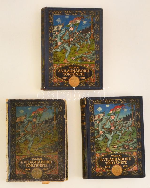 Zigány Árpád: Tolnai: a világháború története. 1-3. köt. Bp., é. n., Magyar Kereskedelmi Közlöny Hírlap- és Könyvkiadó-vállalat. Díszes vászonkötésben, az egyik kötet gerince sérült, javításra szorul, egyébként jó állapotban.